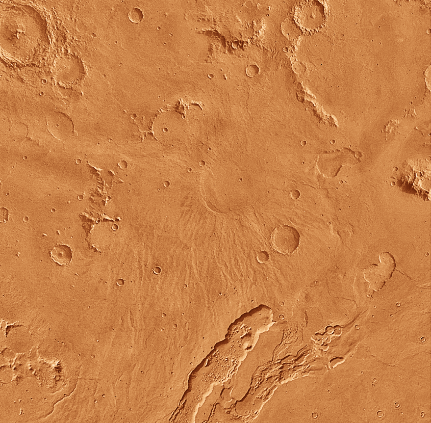 Much like Tyrrhena Patera, Hadriaca Patera is a deeply eroded feature having little vertical relief. Several impact craters are superimposed on the eroded flanks, indicating a great age for this volcano. A large channel has its source near the southeastern margin of the volcano; the fluid that carved the channel flowed southwest into the interior of the Hellas basin. This image is Copyright © by Calvin J. Hamilton. Any commercial/for-profit use of this image needs to be addressed to Calvin J. Hamilton. Caption by LPI. |