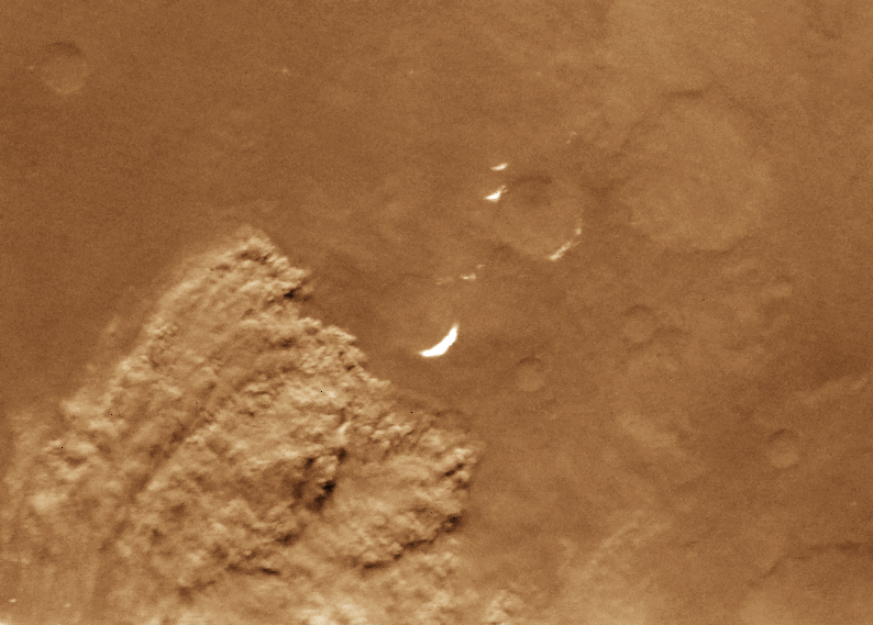 Local dust storms are relatively common on Mars. They tend to occur in areas of high topographic and/or high thermal gradients (usually near the polar caps), where surface winds would be strongest. This storm is several hundreds of kilometers in extent and is located near the edge of the south polar cap. Some local storms grow larger, others die out. (Courtesy Calvin J. Hamilton, and LPI) This image is Copyright © by Calvin J. Hamilton. Any commercial/for-profit use of this image needs to be addressed to Calvin J. Hamilton. |