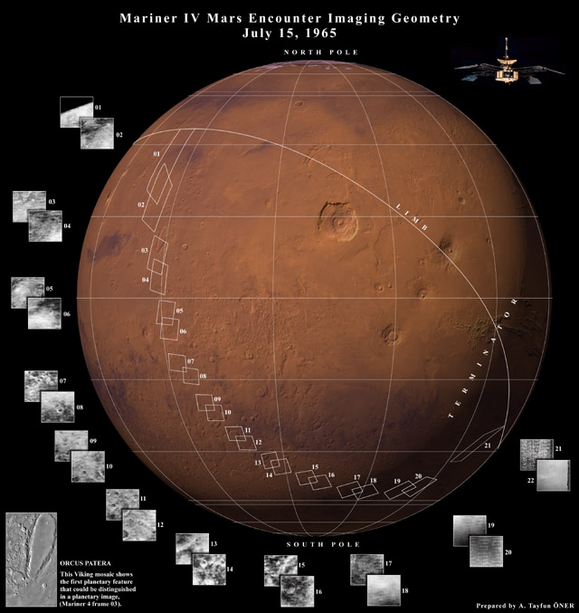 Mariner IV was the fourth in a series of spacecraft used for planetary exploration in a flyby mode and the first spacecraft to succesfully image a planet. It was launched on 28 November 1964 by an Atlas/Agena rocket and flew by Mars on July 15, 1965. The total data returned by the mission was 5.2 million bits including 21 pictures plus 21 lines of a 22nd picture and took more than a week to transmit to earth with the 8.33 bps transmission rate of the spacecraft. The images returned showed a Moon-like cratered terrain (which later Mariner IX showed was not typical for Mars, but only for the more ancient region imaged by Mariner IV). Though not as good looking as images returned by later missions these 22 images are mankind's first images taken by a planetary spacecraft and have great historical value. This image is Copyright © by A. Tayfun Oner. |