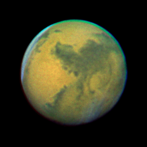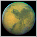 Exposures taken through separate red, green and blue filters are used to create a color image of Mars. The red filter shows the best surface detail. Mars' atmosphere scatters blue light, much like that of Earth, thus Martian surface detail is obscured in the blue filter exposure which permits clouds to be seen easily. A polar hood of clouds over Mars' north pole is evident and a thin sheet of morning clouds can be seen on the western limb. |