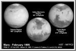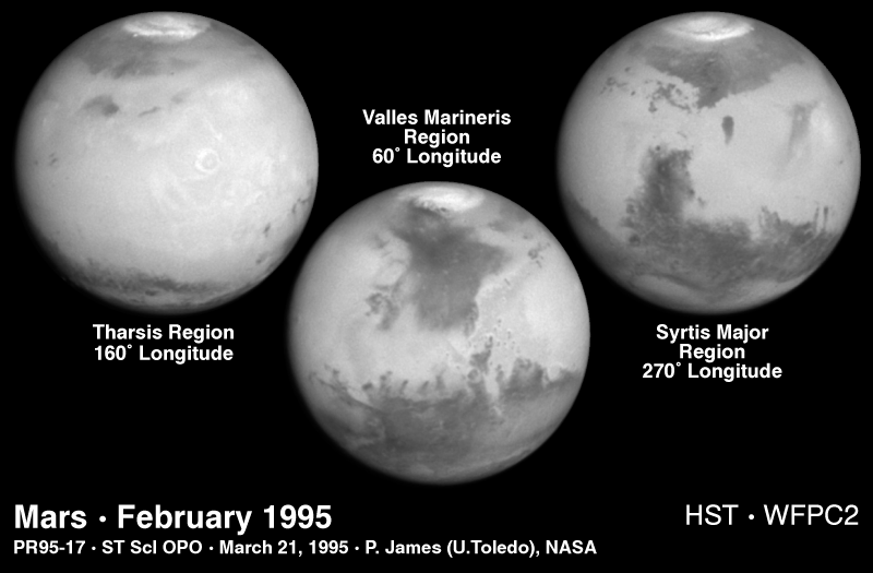 These NASA Hubble Space Telescope views provide the most detailed complete global coverage of the red planet Mars ever seen from Earth. The pictures were taken on February 25, 1995, when Mars was at a distance of 65 million miles (103 million km). To the surprise of researchers, Mars is cloudier than seen in previous years. This means the planet is cooler and drier, because water vapor in the atmosphere freezes out to form ice-crystal clouds. Hubble resolves Martian surface features with a level of detail only exceeded by planetary probes, such as impact craters and other features as small as 30 miles (50 kilometers) across. Tharsis region - A crescent-shaped cloud just right of center identifies the immense shield volcano Olympus Mons, which is 340 miles (550 km) across at its base. Warm afternoon air pushed up over the summit forms ice-crystal clouds downwind from the volcano. Farther to the east (right) a line of clouds forms over a row of three extinct volcanoes which are from north to south: Ascraeus Mons, Pavonis Mons, Arsia Mons. It's part of an unusual, recurring "W"-shaped cloud formation that once mystified earlier ground-based observers. Valles Marineris region - The 16 mile-high volcano Ascraeus Mons pokes through the cloud deck along the western (left) limb of the planet. Other interesting geologic features include (lower left) Valles Marineris, an immense rift valley the length of the continental United States. Near the image center lies the Chryse basin made up of cratered and chaotic terrain. The oval-looking Argyre impact basin (bottom) appears white due to clouds or frost. Syrtis Major region - The dark "shark fin" feature left of center is Syrtis Major. Below it the giant impact basin Hellas. Clouds cover several great volcanos in the Elysium region near the eastern (right) limb. As clearly seen in the Hubble images, past dust storms in Mars' southern hemisphere have scoured the plains of fine light dust and transported the dust northward. This leaves behind a relatively coarser, and less reflective sand in, predominantly, the southern hemisphere. The pictures were taken with Hubble's Wide Field Planetary Camera 2.