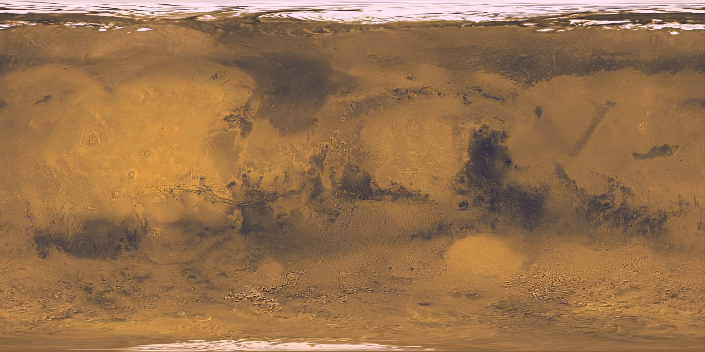 This color cylindrical map of Mars was produced by the USGS from Viking spacecraft data. |