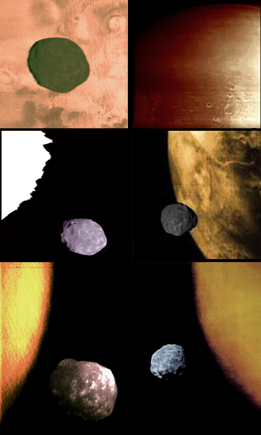 This is a collection of all the color imagery taken by Phobos II containing both Phobos and Mars, and Mars alone as shown in the upper right-hand corner. The photos in the upper left, middle right, and lower right were processed by he Russians at IKI followed by Ted Stryk to reduce the color enhancements IKI made. The middle and lower left images, as well as the top right, were processed Ted Stryk from black and white Phobos II images. They have been corrected for distortion. The color composite was made by combining the red, blue, and an artificially produced green image made by averaging the red and blue channels. The red channel in the upper left image was so badly overexposed that is was nearly a washout, so the color data is extremely poor. Unknown at the time taken, the image at the middle left, with the badly overexposed disk of mars, was to be the last color image of the Russian planetary program, taken two days before contact was lost forever with Phobos II. |