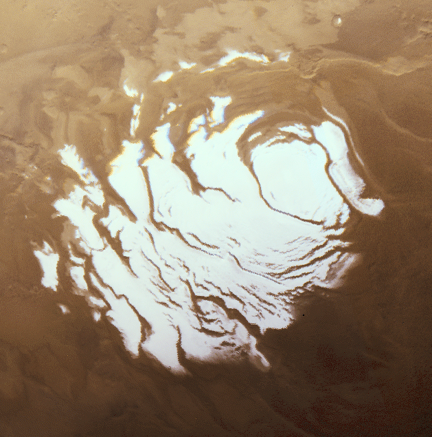 This image shows the south polar cap of Mars as it appears near its minimum size of about 400 kilometers (249 miles). It consists mainly of frozen carbon dioxide. This carbon dioxide cap never melts completely. The ice appears reddish due to dust that has been incorporated into the cap. |