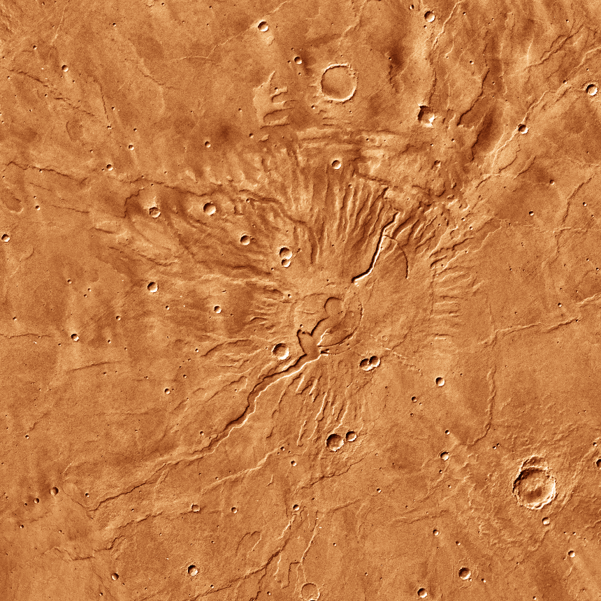 Volcanoes located within the densely cratered southern highlands have a very different morphology from either the Tharsis or Elysium volcanoes. Tyrrhena Patera has very little vertical relief (< 2 kilometers), resulting in very shallow flank slopes. The flanks of the volcano are deeply eroded with many broad channels that radiate from the summit region. The low relief and easily erodible nature of the flank materials has been interpreted to indicate that the bulk of the volcano is composed of pyroclastic ash deposits. This interpretation implies that the style of eruption for the highland volcanoes like Tyrrhena Patera is significantly different from the repeated effusion of fluid lavas that built up the shield volcanoes. This image is Copyright © by Calvin J. Hamilton. Any commercial/for-profit use of this image needs to be addressed to Calvin J. Hamilton. Caption by LPI. |