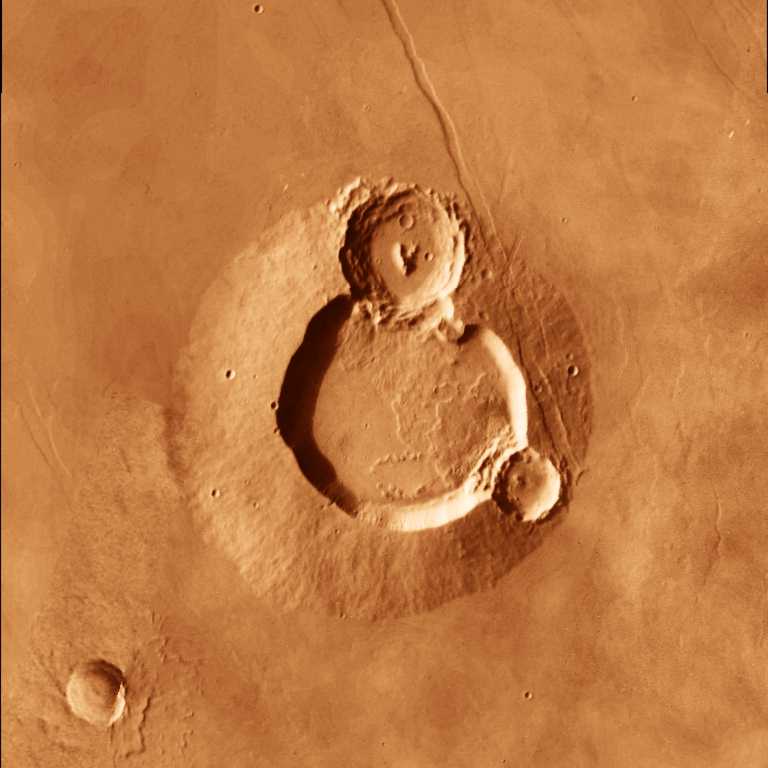 This feature is an example of a class of volcanoes that are considerably smaller than the broad shield volcanoes. The summit consists of a single, very circular caldera with a smooth floor that predates the ejecta from two large impact craters. The lower flanks of the volcano, including portions of the impact craters, have been buried by the material that makes up the surrounding plains. This superpositional relationship indicates that the plains were emplaced subsequent to both the volcano and the large impact craters on the volcano. The plains are probably made up of lava supplied from Tharsis Montes that flowed down the sides of the broad uplift associated with the Tharsis shields. Both the plains and the volcano are cut by a graben, indicating tectonic activity subsequent to the emplacement of the plains. This image is Copyright © by Calvin J. Hamilton. Any commercial/for-profit use of this image needs to be addressed to Calvin J. Hamilton. Caption by LPI. |