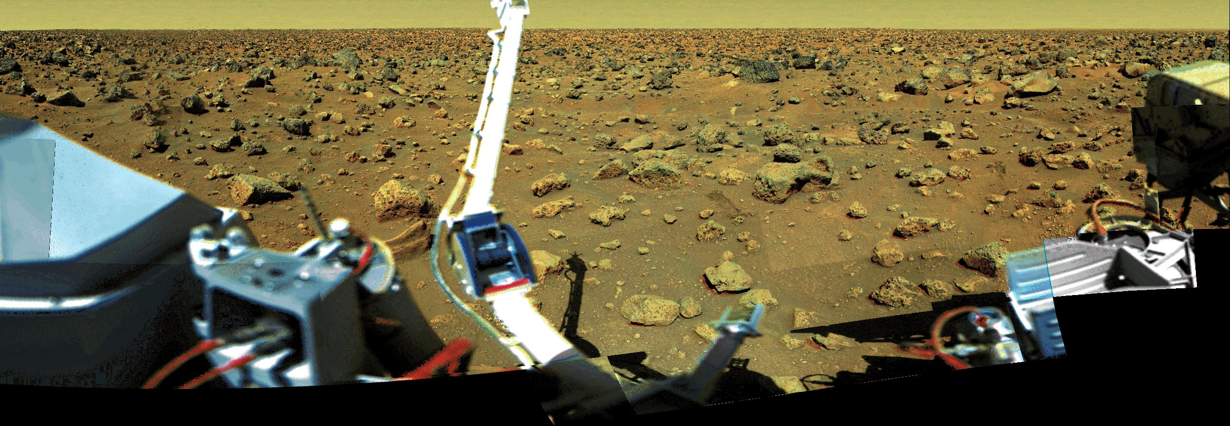 The Viking Lander 2 site in Utopia Planitia has more and larger blocks of stone than does the Viking Lander 1 site in Chryse Planitia. The stones are probably ejecta from impact craters near the Lander 2 site. Many of the rocks are angular and are thought to be only slightly altered by the action of wind and other forms of erosion. Drifts of sand and dust are smaller and less noticeable at the Lander 2 site. The overall red coloring of the Martian terrain is due to the presence of oxidized iron in the regolith. The pink color of the sky is caused by extremely fine red dust that is suspended in Mars' thin atmosphere. |