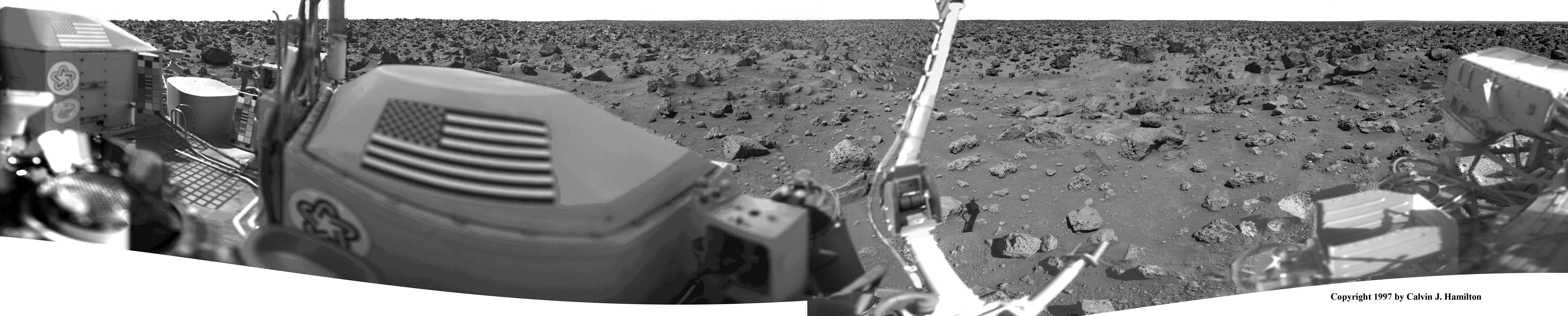 This monster mosaic of Utopia Planitia was created from more than 20 of the highest resolution images taken by Viking Lander 2. A few holes containing the Viking Lander were filled by lower resolution images. The Viking Lander 2 site looks like a rocky desert on Earth. It is rocker than at the lander 1 site and is less hilly. There are no drifts of sand close to the lander; however, several channels measuring as large as a meter in width and up to 10 cm deep, meanders through the pictures. The smoothness of the soil suggests that the rocks sit upon a layer of hard packed sediment. One of the footpads of Viking Lander 2 is on a rock which creates about a 8° slope for the camera and create a hill like appearence. This image has been geometrically corrected to take into account this 8° slope. For a comparison with the non-geometrically corrected image see the image "vlmos2". This image is Copyrighted © 1997 by Calvin J. Hamilton. Any commercial/for-profit use of this image needs to be addressed to Calvin J. Hamilton. |