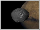 This animation is based upon the Phobos shape model and photomosaics of Phil Stooke, and the USGS hemispheric mosaics of Syrtis and Schiaparelli for Mars. The Sun, Phobos and Mars are appropriately scaled in size and distance. The view is a mild telephoto, with a width of 37 degrees. Phobos is over a point on the Martian equator at 323 degrees W, where it is local noon with the sun 10 degrees north of the equator. Orange Marslight "fills in" the side of Phobos towards Mars. |