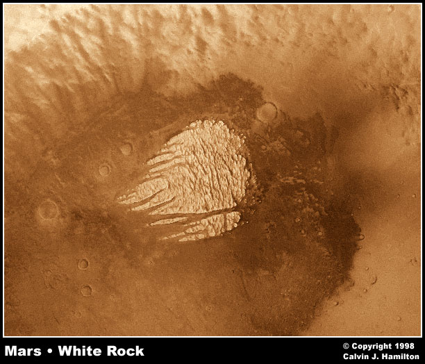 This image shows a lesser known, but unusual feature on Mars. It is called "White Rock". The picture was made from a mosaic of 6 images acquired by the Viking 1 orbiter spacecraft on September 9, 1978. The white feature is eroded crater fill, but exactly how it was formed has not been satisfactorily explained. White Rock was not formed by polar processes because it lies near to the equator at latitude -8 degrees and longitude 355 degrees. It has been modified through aeolian erosion showing transverse and longitudinal erosional features. Future missions will be required to more fully understand the processes that formed this enigmatic formation. This image is Copyright © 1998 by Calvin J. Hamilton. Any commercial/for-profit use of this image needs to be addressed to Calvin J. Hamilton. |