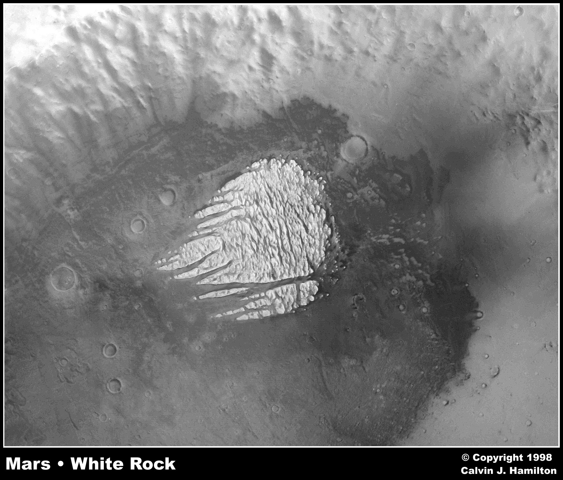 This image shows a lesser known, but unusual feature on Mars. It is called "White Rock". The picture was made from a mosaic of 6 images acquired by the Viking 1 orbiter spacecraft on September 9, 1978. The white feature is eroded crater fill, but exactly how it was formed has not been satisfactorily explained. White Rock was not formed by polar processes because it lies near to the equator at latitude -8 degrees and longitude 355 degrees. It has been modified through aeolian erosion showing transverse and longitudinal erosional features. Future missions will be required to more fully understand the processes that formed this enigmatic formation. This image is Copyright © 1998 by Calvin J. Hamilton. Any commercial/for-profit use of this image needs to be addressed to Calvin J. Hamilton. |