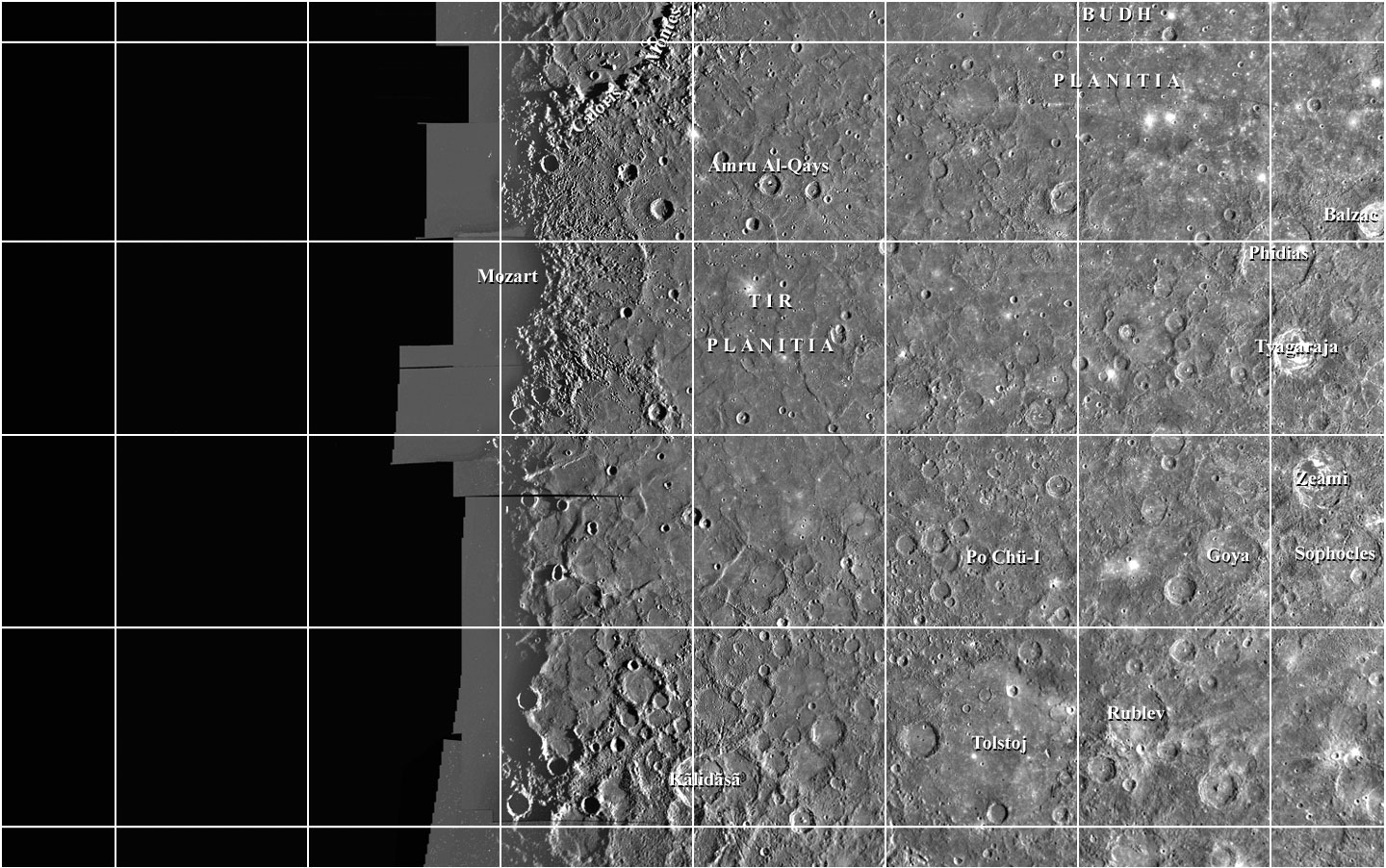 This map of Mercury is in Mercator Projection and covers longitudes 216 to 144 degrees and latitudes 22 to -22 degrees. This image is Copyright © 1999 by A. Tayfun Oner. Any commercial/for-profit use of this image needs to be addressed to Calvin J. Hamilton. |