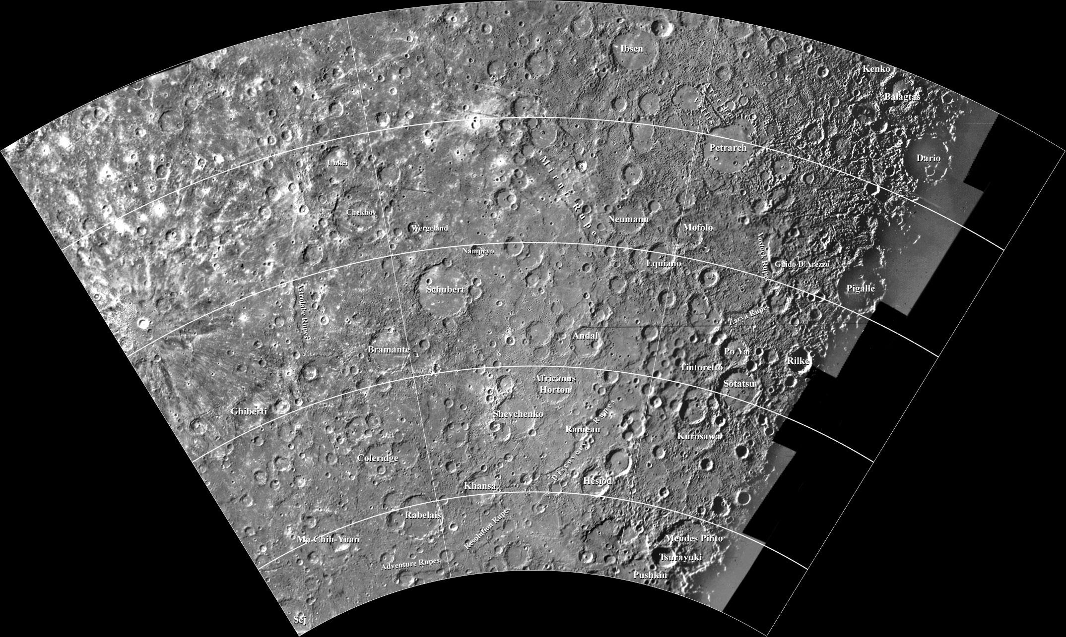 This map of Mercury is in Lambert Conformal Conic Projection and covers longitudes 90 to 0 degrees and latitudes -21 to -66 degrees. This image is Copyright © 1999 by A. Tayfun Oner. Any commercial/for-profit use of this image needs to be addressed to Calvin J. Hamilton. |