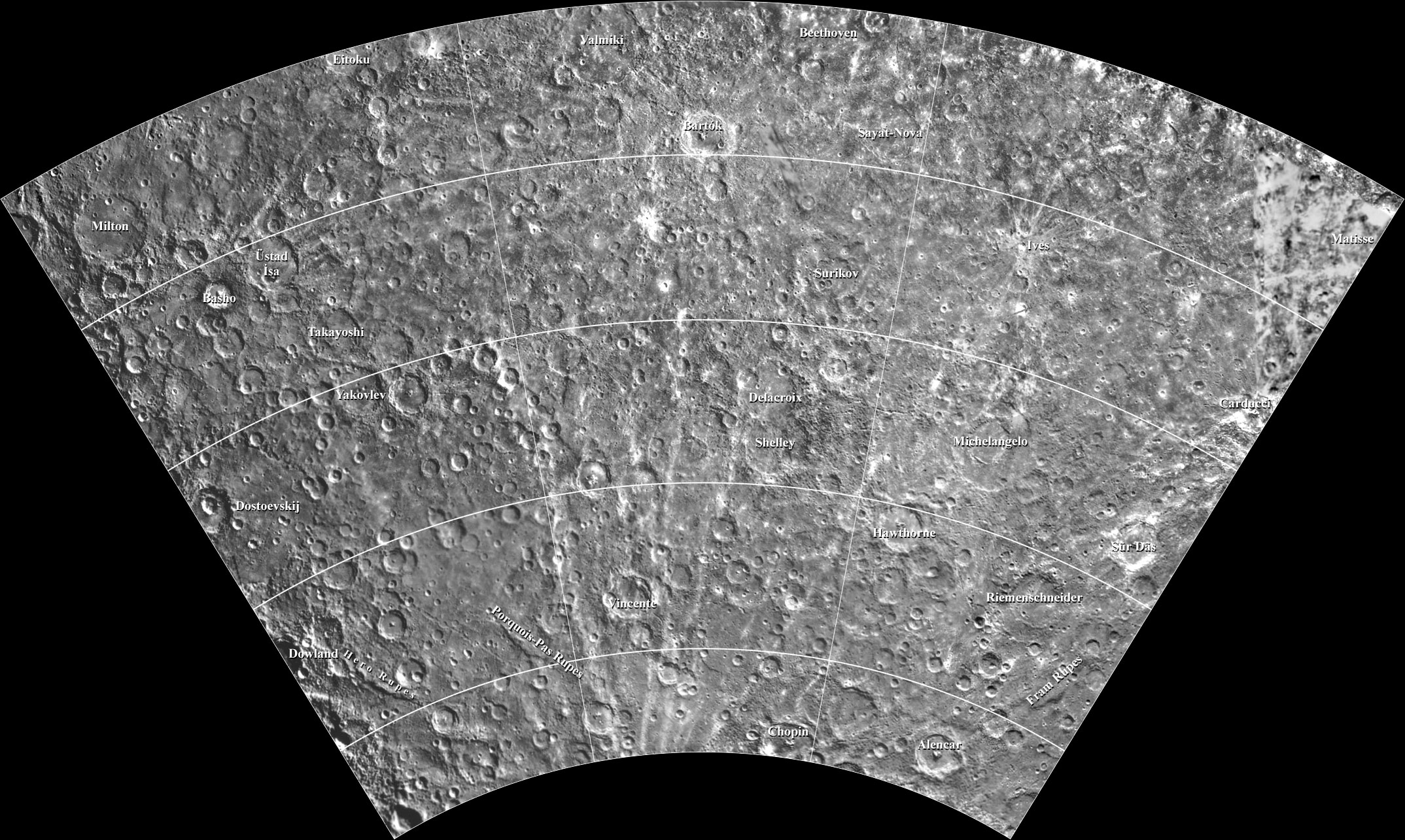 This map of Mercury is in Lambert Conformal Conic Projection and covers longitudes 180 to 90 degrees and latitudes -21 to -66 degrees. This image is Copyright © 1999 by A. Tayfun Oner. Any commercial/for-profit use of this image needs to be addressed to Calvin J. Hamilton. |