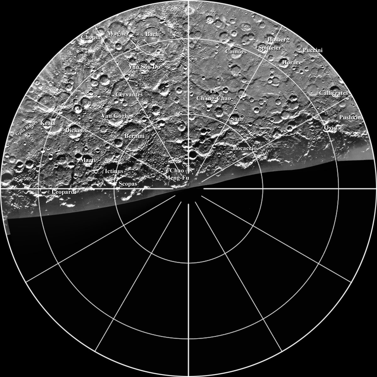 This map of Mercury is in a Polar Stereographic Projection and covers latitudes -65 to -90 degrees. This image is Copyright © 1999 by A. Tayfun Oner. Any commercial/for-profit use of this image needs to be addressed to Calvin J. Hamilton. |