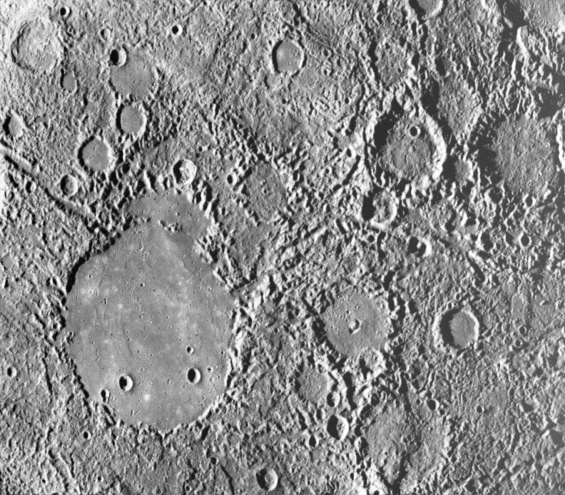 "Weird terrain" best describes this hilly, lineated region of Mercury. This area is at the antipodal point from the large Caloris basin. The shock wave produced by the Caloris impact was reflected and focused to this antipodal point, thus jumbling the crust and breaking it into a series of complex blocks. The area covered is about 100 kilometers (62 miles) on a side. This image is Copyright © by Calvin J. Hamilton. Any commercial/for-profit use of this image needs to be addressed to Calvin J. Hamilton. |