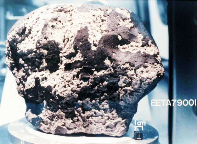 This meteorite, called EETA 79001, was found on the ice in Antarctica, and is quite likely from Mars. For scale, the cube at the lower right is 1 centimeter on a side. The meteorite is partly covered by a black glassy layer, the fusion crust. The fusion crust forms when the meteorite enters the Earth's atmosphere at high speed. Friction heating melts the outer portion of the meteorite. Inside, the meteorite is gray. It is a basalt, very similar to basalts found on Earth. It formed in a volcanic eruption about 180 million years ago. This meteorite is quite likely from Mars because it contains a small amount of gas that is chemically identical to the Martian atmosphere. |