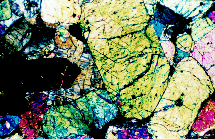 Rocks are often made of small mineral grains that can't be seen clearly without a microscope. To see these small grains, scientists grind and polish rock samples very thin (0.03 millimeters) so light can pass through them. This microscopic view, 2.3 millimeters (.09 inches) across, is in false color, produced by holding polarizing filters above and below the microscopic slide. These filters cause different minerals to have distinctive colors, allowing easy identification of the minerals. Most of this meteorite (in yellow, green, pink, and black) is the mineral olivine, which is common in some basaltic rocks. The striped grain near the center is the mineral pyroxene. (Courtesy Allan Treiman, LPI) |