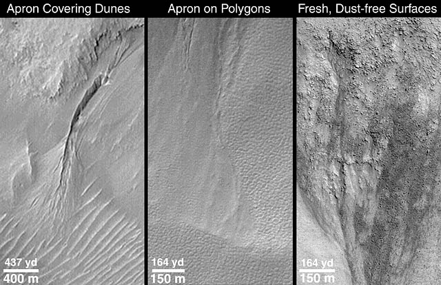 How recent is "recent"? The small martian gullies discovered in Mars Global Surveyor (MGS) Mars Orbiter Camera (MOC) pictures of certain craters, troughs, and valleys between latitudes 30° and 70° appear to be geologically young. This means that, on the scale of a planet that is 4.5 billion years old, the gullies may be only a few million, or less, years old. The youth of these gullies relative to the history of Mars is indicated by the lack of impact craters--formed by meteors--on the alcoves, channels, or aprons of these features. However, other evidence suggests that the gullies may, in many cases, be much younger than a few million years--in fact, some might be actively seeping water in modern times. The first picture, "Apron Covering Dunes," shows a deep, prominent martian gully in a south-facing wall in Nirgal Vallis near 29.4°S, 39.1°W. Sunlight illuminates the scene from the upper left. At the bottom of the picture is a series of evenly-spaced, almost parallel ridges. These ridges are dunes created by windblown sand. The apron--the fanlike deposit at the lower end of the deep channel--at this location is seen covering some of the dunes. The sand dunes are thus older than the apron of debris that came from the channel. The dune field has no small meteor impact craters on it, so it, like the gully landforms, is geologically young--yet older than the apron. If the dunes are active in the modern environment--which is uncertain despite the apparent youth of the dunes--then the apron would have had to form within the past few centuries or less. This picture was taken in September 1999. The second picture, "Apron on Polygons," shows aprons deposited at the base of the south-facing slope in an impact crater at 54.8°S, 342.5°W, in Noachis Terra. The slope and plains surrounding the apron materials have a bumpy pattern of evenly-spaced polygons. Polygonal patterns like this are common in the middle and high latitude regions of Mars, and, like their counterparts in the Arctic and Antarctic regions of Earth, probably form by stresses induced by seasonal and daily freezing and warming cycles of ice in the ground. Such polygons, where found on Earth, are usually only several to tens of thousands of years old, at most. The fact than an apron of debris covers such polygons, and no new polygons have formed on top of the apron, all suggest that the apron--and therefore the gully involved in slope erosion at this location--may be no more than a few tens of thousands of years old, and could be much, much younger. The aprons shown here are from the same July 1999 picture as shown in an accompanying release, "Basic Features of Martian Gullies;" the picture is illuminated from the upper left. The third picture, "Fresh, Dust-free Surfaces," shows a January 2000 view of small, dark channels eroded into one of the gully alcoves found in the "Aerobraking Crater" located at 65°S, 15°W. Two aspects of this picture indicate that two of the processes that contribute to martian gully formation--liquid water seepage and downslope movement of dry, as well as wet, debris--have probably occurred in the near-recent past. In this case, near-recent could mean "within a few days of when the picture was taken" to "within a few years of when the picture was taken." One aspect is the sharp contrast between dark-toned and light-toned surfaces. On Mars, fine, bright dust can settle out of the atmosphere and eventually coat surfaces so that the contrast between dark and light terrains is hidden from view. There was an experiment on the Sojourner Rover in 1997, for example, that found dust to be settling out of the atmosphere almost all of the time during Mars Pathfinder's 83-day mission. If dust were settling on the alcoves and small channels shown here, they would not appear to be so dark relative to the surrounding, bright, dust-covered terrain. The other attribute of the picture that suggests relative youth is the preponderance of boulders and their sharp, crisp relief which indicates that they have not yet broken into finer debris, nor have they been covered up and mantled by sand or dust. Sunlight illuminates the scene from the upper right. |
