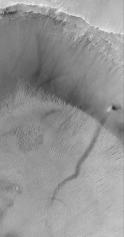 One of the key elements of the Mars Global Surveyor (MGS) Mars Orbiter Camera (MOC) Extended Mission is to look for and monitor changes taking place on the planet over the course of a second---and, eventually, a third---martian year. MGS is now well into its second Mars year, which will draw to a close in December 2002. Among the changes the MOC has observed are streaks believed to be caused by the passage of dust devils. Thousands of MOC images show these streaks, dozens show that they change over time, but far fewer images have actually captured a dust devil in the act of creating a streak. At the center right of this image (above left) is a dust devil that, on May 21, 2002, was seen climbing the wall of a crater at 4.1°S, 9.5°W. This crater (above right) is in western Terra Meridiani. The dust devil was moving toward the northeast (upper right), leaving behind a dark trail where a thin coating of surficial dust was removed or disrupted as the dust devil advanced. Dust devils most commonly form after noon on days when the martian air is still (that is, when there isn't even a faint breeze). On such days, the ground is better able to heat up the air immediately above the surface. As the warmed near-surface air begins to rise, it also begins to spin, creating a vortex. The spinning column then moves across the surface and picks up loose dust (if any is present). The dust makes the vortex visible and gives it a tornado-like appearance. The dust devil in this image has a very short, dark shadow cast to the right of the bright column; this shadow is short because the sun was nearly overhead. |