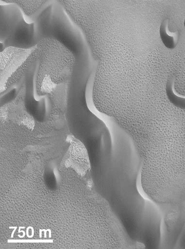 Dunes composed of low albedo (dark) sand grains encircle the north polar cap of Mars. This view was taken during the northern summer in May 1999. |