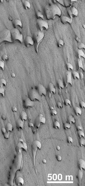 MOC image of dunes in Chasma Boreale, a giant trough in the north polar cap. This September 1998 view shows dark sand emergent from beneath a veneer of bright frost left over from the northern winter that ended in July 1998. |