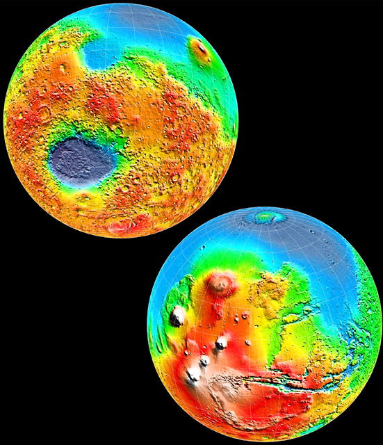 This image shows the topography of two of the hemispheres of Mars. The image was seen on the cover of Science magazine in May of 1999. The most prominant features in this image are: 1) The massive Hellas impact basin (upper-left) in the Southern Hemisphere which is nearly six miles (nine kilometers) deep and 1,300 miles (2,100 kilometers) across. The basin is surrounded by a ring of material that rises 1.25 miles (about two kilometers) above the surroundings and stretches out to 2,500 miles (4,000 kilometers) from the basin center. 2) The lower-right image shows the Tharsis province that contains Tharsis Montes (Ascraeus, Pavonis, and Arsia), and the Valles Marineris canyon system and related outflow channels. |