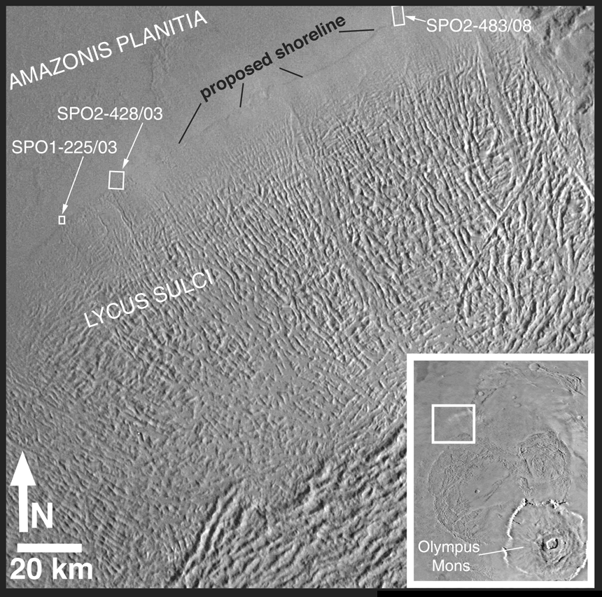 The Amazonis/Lycus Sulci Contact. This Viking image taken in the late 1970s shows the location of a proposed shoreline. The three small white boxes show the locations of the MOC images targeted on the feature in 1998. The inset at the lower right is a Viking image showing the location of the proposed shoreline with respect to Olympus Mons. One of the close up views can be found in shoreln2.htm. |