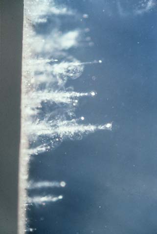 Catching Comet Dust The primary objective of the Stardust mission is to capture both cometary samples and interstellar dust. Main challenges to accomplishing this successfully involve slowing down the particles from their high velocity with minimal heating or other effects that would cause their physical alteration. When the Stardust Spacecraft encounters the Comet Wild 2, the impact velocity of the particles will be up to 6 times the speed of a rifle bullet. Although the captured particles will each be smaller than a grain of sand, high-speed capture could alter their shape and chemical composition - or even vaporize them entirely. To collect particles without damaging them, Stardust uses an extraordinary substance called aerogel. This is a silicon-based solid with a porous, sponge-like structure in which 99.8 percent of the volume is empty space. By comparison, aerogel is 1,000 times less dense than glass, which is another silicon-based solid. When a particle hits the aerogel, it buries itself in the material, creating a carrot-shaped track up to 200 times its own length. This slows it down and brings the sample to a relatively gradual stop. Since aerogel is mostly transparent - with a distinctive smoky blue cast - scientists will use these tracks to find the tiny particles. |