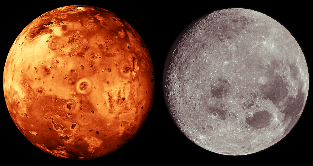 This image shows the relative scale of Io and the Moon. Io is at the left and the Moon is at the right. The scale is approximately 7.3 kilometers per pixel. This image is Copyright © by Calvin J. Hamilton. Any commercial/for-profit use of this image needs to be addressed to Calvin J. Hamilton. |