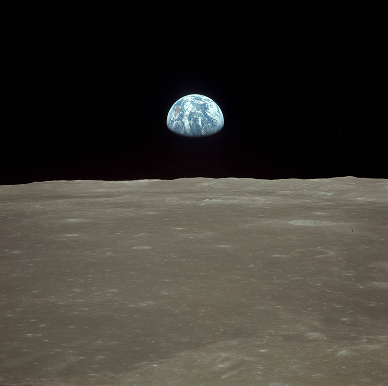 This view of the Earth rising over the Moon's horizon was taken from the Apollo 11 spacecraft. The lunar terrain pictured is in the area of Smyth's Sea on the nearside. |