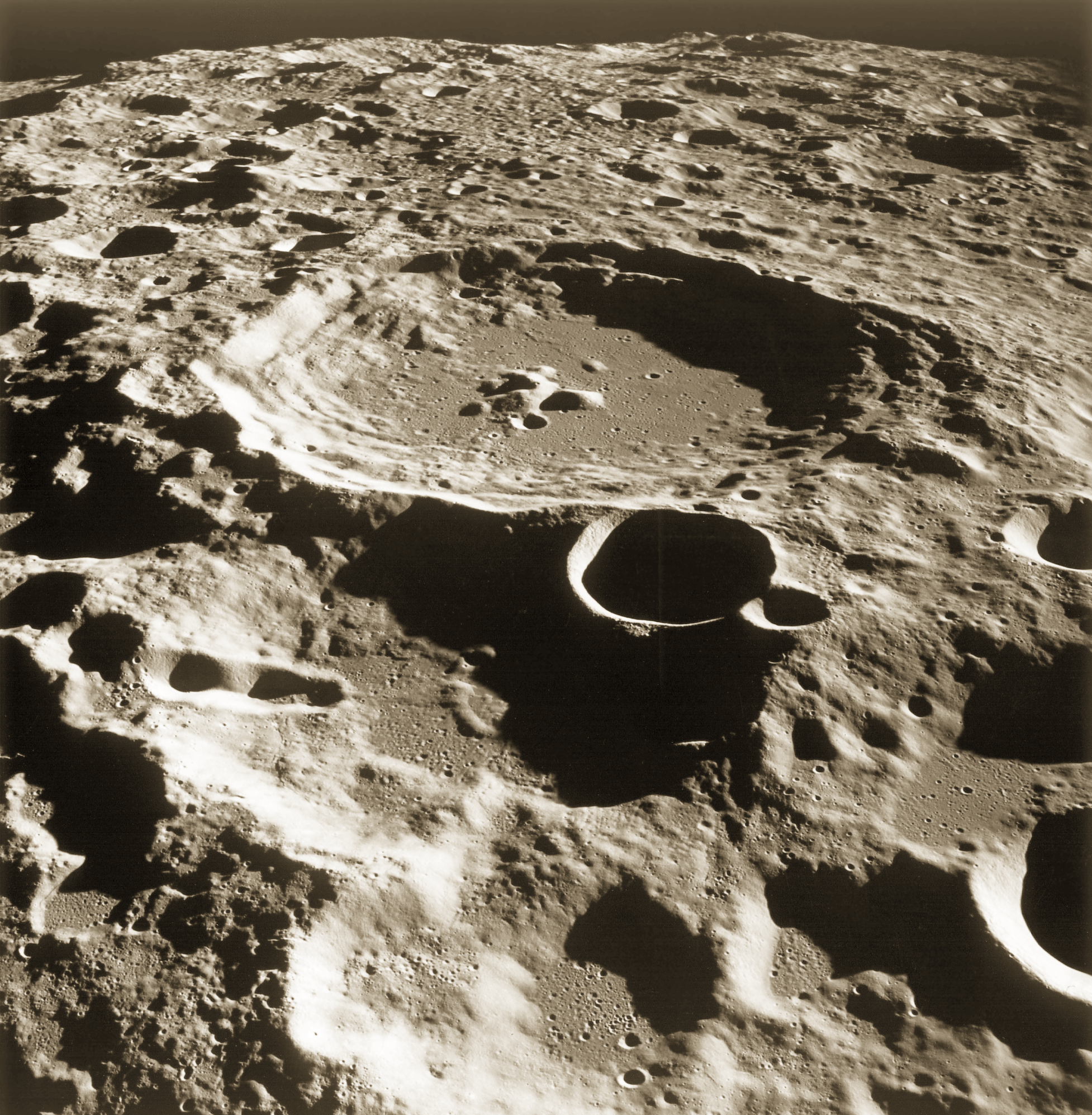 This image was taken by Apollo 11 astronauts in 1969. It shows a portion of the Moon's heavily cratered far side. The large crater is approximately 80 km ( 50 miles ) in diameter. The rugged terrain seen here is typical of the farside of the Moon. |