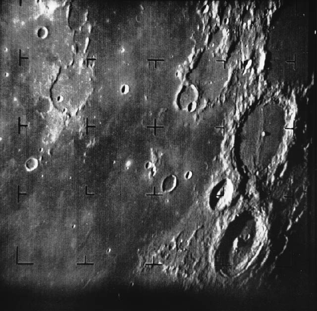 Ranger 7 took this image, the first picture of the Moon by a U.S. spacecraft, on 31 July 1964 at 13:09 UT (9:09 AM EDT) about 17 minutes before impacting the lunar surface. The area photographed is centered at 13 S, 10 W and covers about 360 km from top to bottom. The large crater at center right is the 108 km diameter Alphonsus. Above it is Ptolemaeus and below it Arzachel. The terminator is at the bottom right corner. Mare Nubium is at center and left. North is at about 11:00 at the center of the frame. The Ranger 7 impact site is off the frame, to the left of the upper left corner.