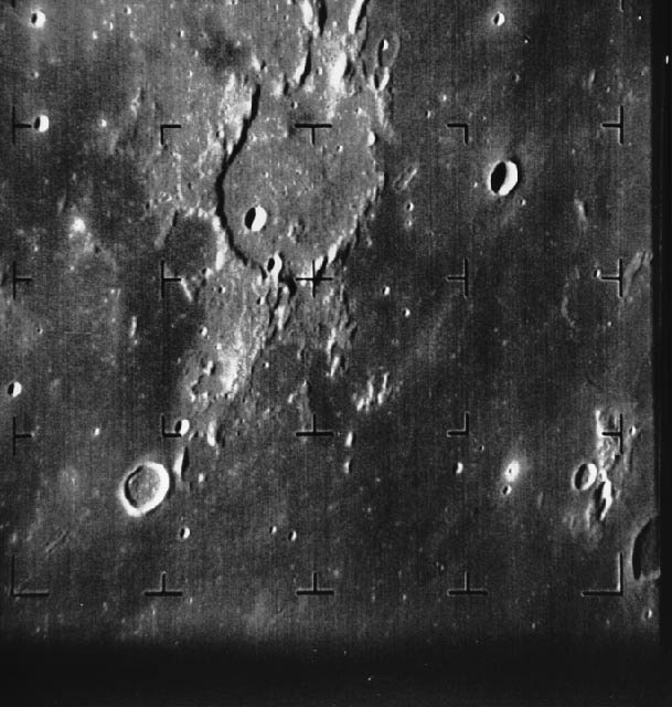 Ranger 7 B-camera image of Guericke crater (11.5 S, 14.1 W, diameter 63 km) taken from a distance of 1335 km. The dark flat floor of Mare Nubium dominates most of the image, which was taken 8.5 minutes before Ranger 7 impacted the Moon on 31 July 1964. The frame is about 230 km across and north is at 12:30. The impact site is off the frame to the left.