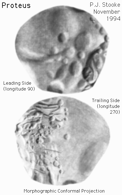 This is a shaded relief map of Proteus, a small inner satellite of Neptune. As with all maps, it is the cartographer's interpretation and not all features are necessarily certain given the limited data available - this interpretation stretches the data as far as is feasible. The original map was published in its full form with latitude-longitude grid and feature names, in: Stooke, P.J., 1994. "The Surfaces of Larissa and Proteus", EARTH, MOON AND PLANETS, V. 65, pp. 31-54.Positions in the map are controlled by a digital shape model, described in that paper. For this map, the three dimensional convex hull of the shape model was projected into the Morphographic Conformal Projection (the conventional Stereographic Projection modified for non-spherical worlds). The leading side (longitude 90 runs vertically down the centre) faces forwards in the orbit of Proteus. The trailing side (longitude 270 runs vertically down its centre) faces backwards along the orbit. Longitude 0 is at the righthand end of the leading side, and faces Neptune. As with all conformal (true shape) projections, the scale in these maps varies, increasing from the centre to the outer edge. The map projection is described in: Stooke, P.J. and Keller, C.P., 1990. "Map Projections for Non-Spherical Worlds / the Variable-Radius Map Projections", CARTOGRAPHICA, V. 27, No. 2, pp. 82-100. This version of the file, with labels intact, is in the public domain. Philip Stooke, Department of Geography, University of Western Ontario, London, Ontario, Canada N6A 5C2 stooke@sscl.uwo.ca |