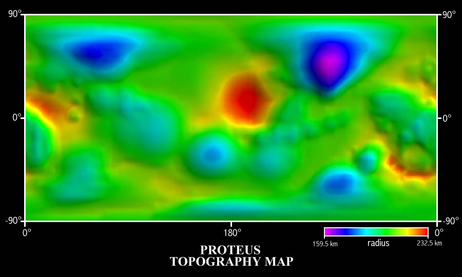 This is a topographic map of Proteus It is based upon the shape model of Phil Stooke. As with all maps, it is the cartographer's interpretation; not all features are necessarily certain given the limited data available. This interpretation stretches the data as far as possible. This image is Copyrighted © 2000 by A. Tayfun Oner. Any commercial/for-profit use of this image needs to be addressed to Calvin J. Hamilton. |