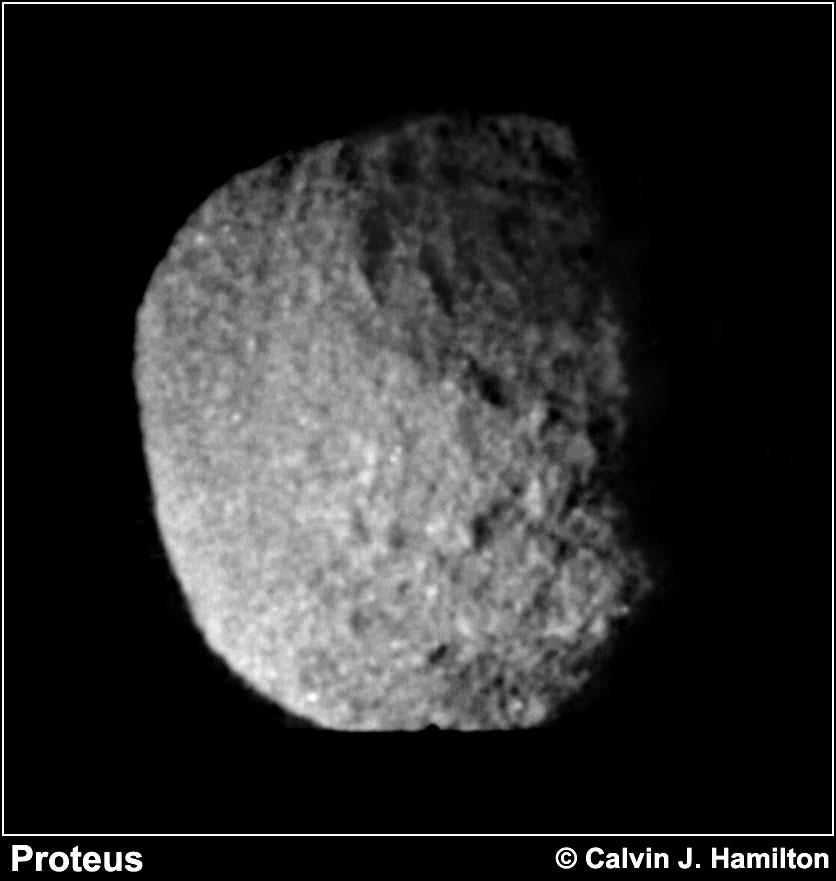 Voyager 2 took this image of Neptune's irregularly - shaped satellite 1989N1 from a range of 870,000 kilometers (540,000 miles. The resolution is 8 kilometers (5 miles) per pixel. The satellite has an average radius of about 200 kilometers (120 miles) and is uniformly dark with an albedo of about 6 percent. The irregular shape suggests that 1989N1 has been cold and rigid throughout its history and subject to significant impact cratering. This image is Copyright © 2001 by Calvin J. Hamilton. Any commercial/for-profit use of this image needs to be addressed to the Author. |