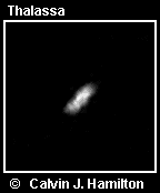 Thalassa appears to be about 80 kilometers (50 miles) in diameter. It orbits Neptune in 7 hours, 30 minutes about 25,200 kilometers (15,700 miles) above the cloud tops. It is irregularly shaped and shows no sign of any geological modification. Thalassa circles the planet in the same direction as Neptune rotates. This image has been slightly smeared so that Thalassa appears highly elongated. This image is Copyright © by Calvin J. Hamilton. Any commercial/for-profit use of this image needs to be addressed to Calvin J. Hamilton. |