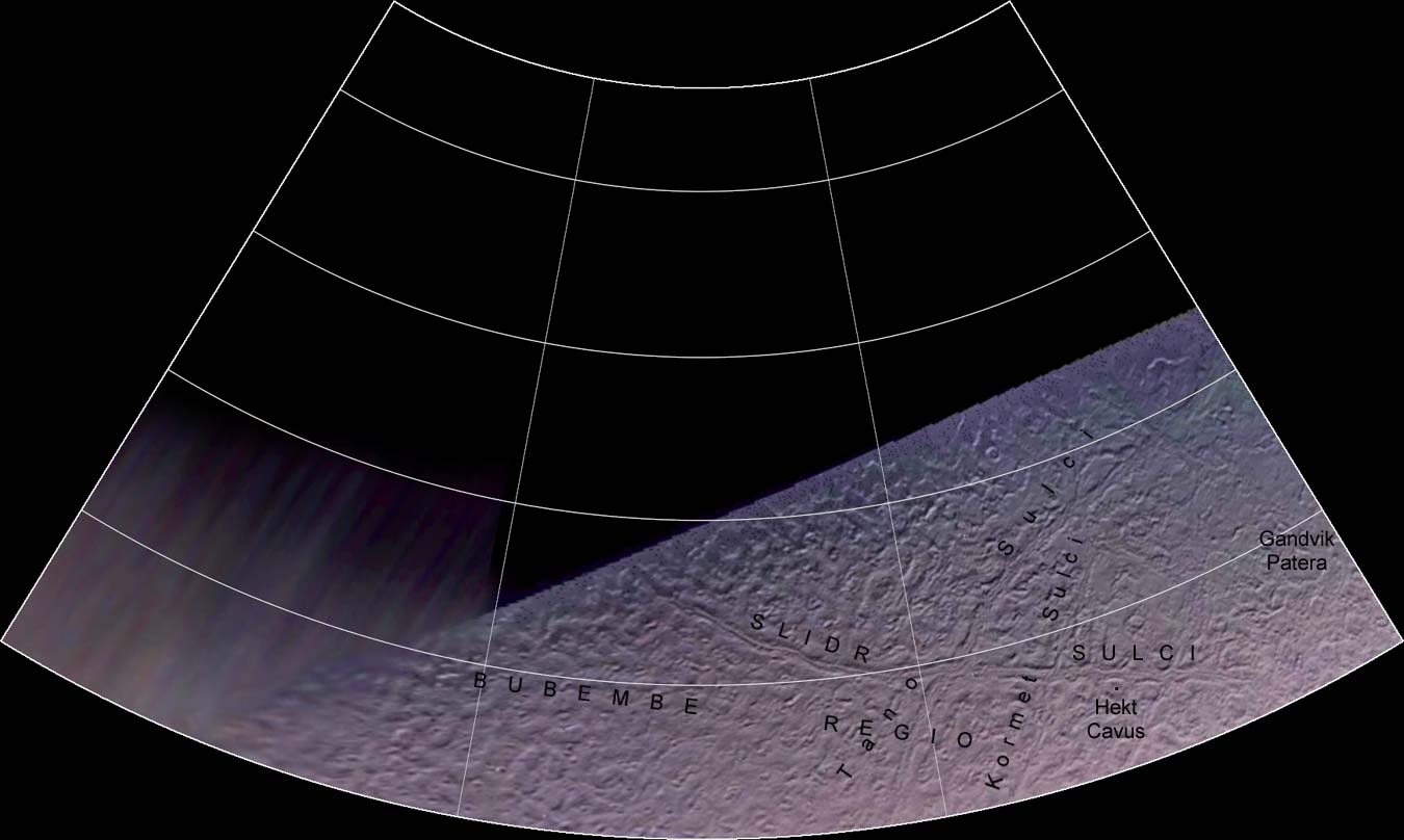 This quadrangle of Triton covers +66 to +21 degrees latitude and 0 to 90 degrees longitude in Lambert Conformal Conic Projection. This image is Copyrighted © 1998 by A. Tayfun Oner. Any commercial/for-profit use of this image needs to be addressed to Calvin J. Hamilton. |