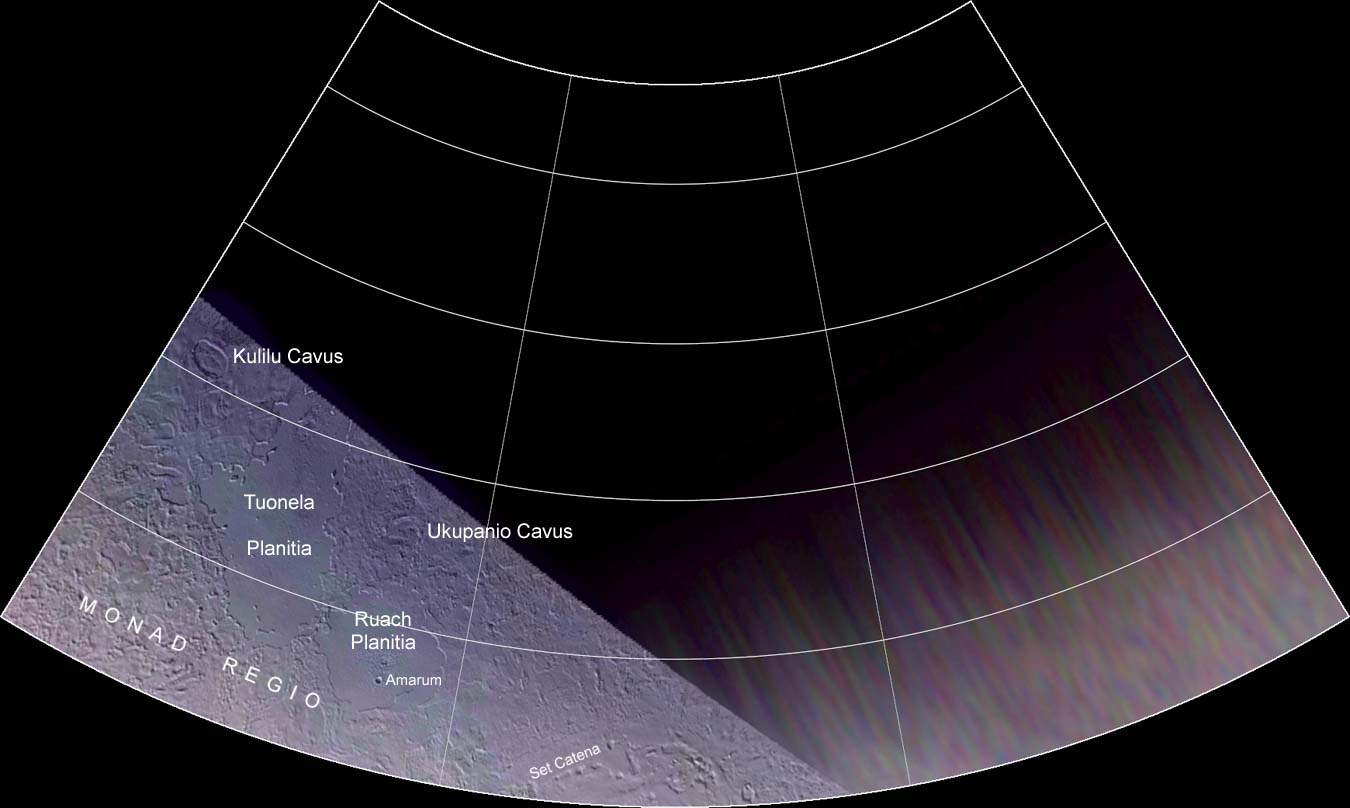 This quadrangle of Triton covers +66 to +21 degrees latitude and 270 to 0 degrees longitude in Lambert Conformal Conic Projection. This image is Copyrighted © 1998 by A. Tayfun Oner. Any commercial/for-profit use of this image needs to be addressed to Calvin J. Hamilton. |