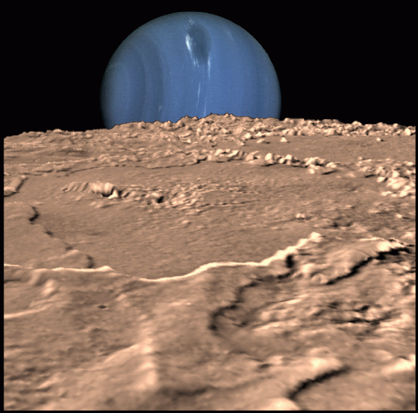 Composite view showing Neptune on Triton's horizon. Neptune's south pole is to the left; clearly visible in the planets' southern hemisphere is a Great Dark Spot, a large anticyclonic storm system located about 20 degrees South. The foreground is a computer generated view of Triton's maria as they would appear from a point approximately 45 km above the surface. The terraces visible in this image indicate multiple episodes of 'cryovolcanic' flooding. This three-dimensional view was created from a Voyager image by using a two- dimensional photoclinometric model. Relief has been exaggerated roughly 30-fold, the actual range of the relief is about 1 km. Would Neptune appear to be rising or setting? Neither, due to the motion of Triton relative to Neptune, it would appear to move laterally along the horizon, eventually rising and setting at high latitudes. |