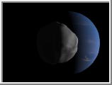 This animation is based upon the Proteus shape model and map of Phil Stooke. Neptune is made by projecting a Voyager 2 photo on to an ellipsoid of the appropriate dimensions. The view angle is mildly telephoto - 40 degrees, and the Sun is to the west of Proteus to fit in with Phil's shading and to show the Southern Hemisphere Depression to advantage, while darkening the relatively blank areas of the map. |