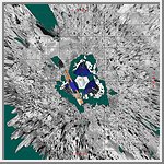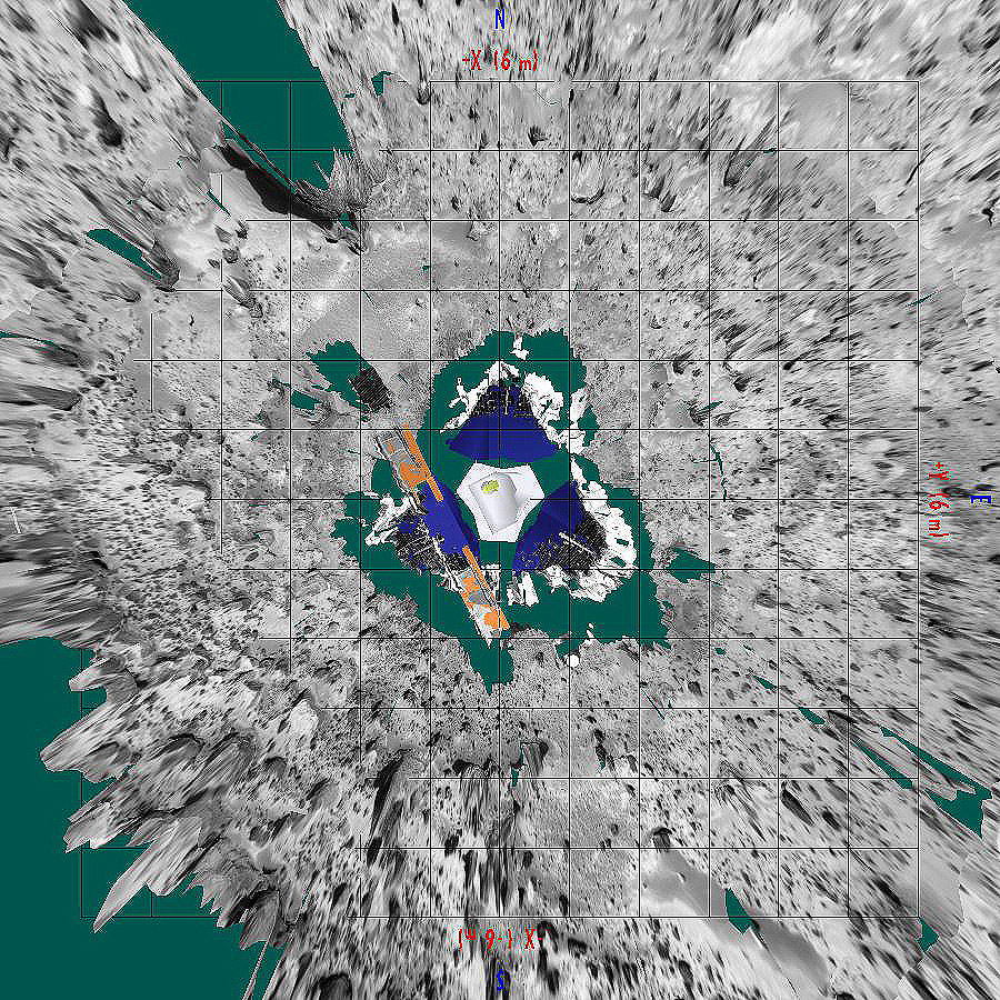 This image, prepared by Pathfinder scientists at NASA/Ames Research Center, is a view of the landing site from above. Seen in the lower right is Mermaid dune, with its long axis oriented northwest-southeast and its steeper side, the presumed slipface, toward the southwest. Dunes like Mermaid, the depositional tails and erosional moats associated with rocks in the area, and the fluted and polished surfaces on several boulders at the landing site all indicate an effective wind that blows from the northeast to the southwest. Mars Pathfinder is the second in NASA's Discovery program of low-cost spacecraft with highly focused science goals. |