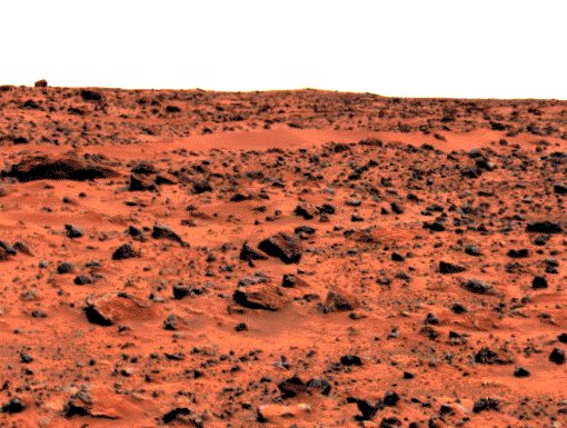This enhanced color image of the Pathfinder landing site shows the eastern horizon. The elongated, reddish, low contrast region in the distance is "Roadrunner Flats". This image was taken by the Imager for Mars Pathfinder (IMP). Mars Pathfinder is the second in NASA's Discovery program of low-cost spacecraft with highly focused science goals. The Jet Propulsion Laboratory, Pasadena, CA, developed and manages the Mars Pathfinder mission for NASA's Office of Space Science, Washington, D.C. JPL is a division of the California Institute of Technology (Caltech). The Imager for Mars Pathfinder (IMP) was developed by the University of Arizona Lunar and Planetary Laboratory under contract to JPL. Peter Smith is the Principal Investigator. |