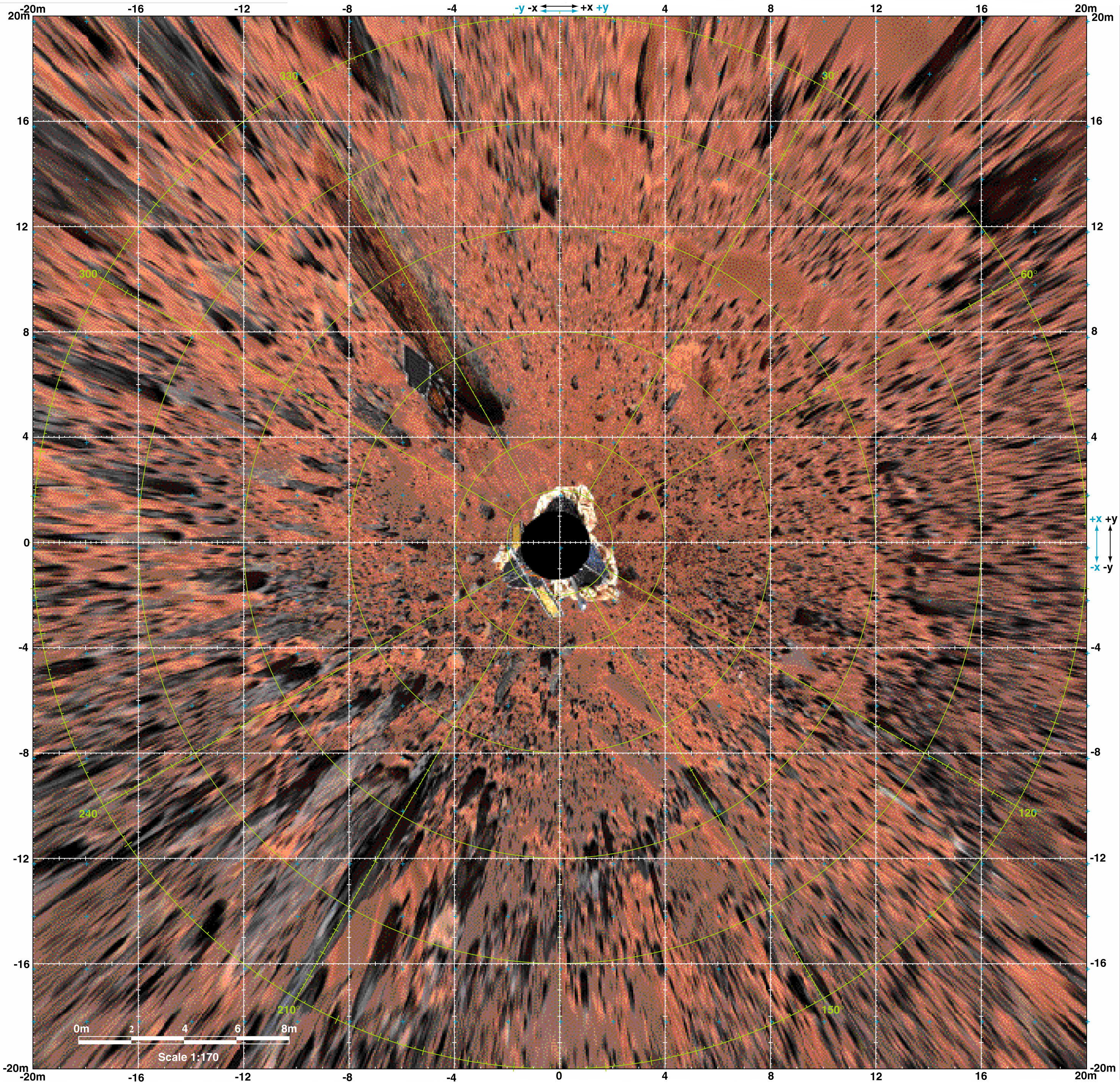 Planimetric (overhead view) map of the landing site, to a distance of 20 meters from the spacecraft. North is at the top in this and Plates 3-5. To produce this map, images were geometrically projected onto an assumed mean surface representing the ground. Features above the ground plane (primarily rocks) therefore appear displaced radially outward; the amount of distortion increases systematically with distance. The upper surfaces of the lander and rover also appear enlarged and displaced because of their height. Primary grid (white) is based on the Landing Site Cartographic (LSC) coordinate system, defined with X eastward, Y north, and Z up, and origin located at the mean ground surface immediately beneath the deployed position of the IMP camera gimbal center. Secondary ticks (cyan) are based on the Mars local level (LL) frame, which has X north, Y east, Z down, with origin in the center of the lander baseplate. Rover positions (including APXS measurements) are commonly reported in the LL frame. Yellow grid shows polar coordinates based on the LSC system. Cartographic image processing by U.S. Geological Survey. NOTE: original caption as published in Science Magazine, Volume 278, Number 5344, 5 December 1997, 'Mars Pathfinder Foldout' (Plate 2). |