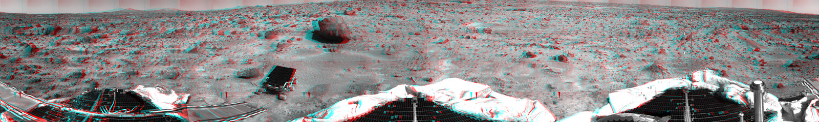 This anaglyph panorama may be viewed using red/blue glasses to see it in stereo 3D. The panorama was captured by the Pathfinder lander early in the mission using the red filter on both the left and right cameras. These two images were assembled so that foreground elements merge and the image seems to recede from the picture plane when viewed in stereo. |