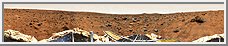 This is the "gallery" or "presidential" panorama taken by the Pathfinder lander. Roughly 100 frames have been stitched manually to produce this seamless image. The color has been processed to retain as much of the dynamic range of the original color filters as possible while still keeping the hues in the color space of JPL's calibrated color images. The goal of the color balancing was to provide a view of the terrain that as clearly as possible showed differentiations in rock and soil types. The sky and a small area near the low gain antenna have been retouched. |