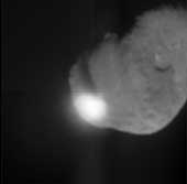 When NASA's Deep Impact probe collided with Tempel 1, a bright, small flash was created, which rapidly expanded above the surface of the comet. This flash lasted for more than a second. Its overall brightness is close to that predicted by several models. After the initial flash, there was a pause before a bright plume quickly extended above the comet surface. The debris from the impact eventually cast a long shadow across the surface, indicating a narrow plume of ejected material, rather than a wide cone. The Deep Impact probe appears to have struck deep, before gases were heated and explosively released. The impact crater was observed to grow in size over time. A preliminary interpretation of these data indicate that the upper surface of the comet may be fluffy, or highly porous. The observed sequence of impact events is similar to laboratory experiments using highly porous targets, especially those that are rich in volatile substances. The duration of the hot, luminous gas phase, as well as the continued growth of the crater over time, all point to a model consistent with a large crater. This image was taken by Deep Impact's medium-resolution camera. |
