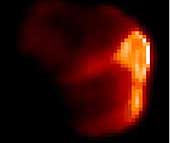 Figure 1: Temperature Map This image composite shows comet Tempel 1 in visible (left) and infrared (right) light (figure 1). The infrared picture highlights the warm, or sunlit, side of the comet, where NASA's Deep Impact probe later hit. These data were acquired about six minutes before impact. The visible image was taken by the medium-resolution camera on the mission's flyby spacecraft, and the infrared data were acquired by the flyby craft's infrared spectrometer. |