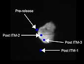 This image shows how Deep Impact's impactor targeted comet Tempel 1 as the spacecraft made its final approach in the early morning hours of July 4, Eastern time. The autonomous navigation system on the probe was designed to make as many as three impactor targeting maneuvers, identified as ITMs in this picture, to correct its course to the comet. The upper left dot indicates where the probe would have passed the comet's nucleus if no maneuvers were performed. The dot below the nucleus shows where the probe would have flown past the comet if only the first maneuver was made. The leftmost dot on the nucleus marks the spot where the probe would have crunched the comet if only the first two maneuvers had been performed. The lower dot on the nucleus indicates the vicinity where, once the third maneuver was performed, the probe met its final reward and collided with the comet. |